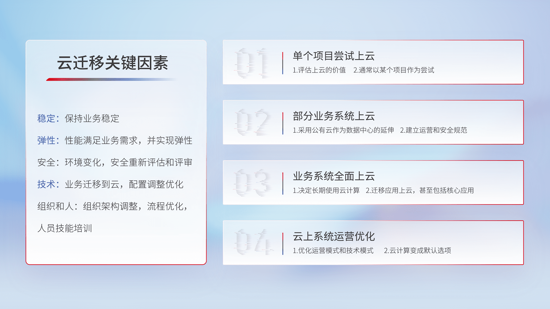 结合实际业务,,从规划设计、、、云平台选型、、、、云原生改造、、数据迁移、、集成交付,,迁移全过程为客户识别最佳上云路径,,,做好风险识别管理,,设计网络架构、、、、身份权限、、、安全审计合规、、、、操作审计、、、日志审计、、、、监控告警策略、、、、多站点容灾设计等,,,,对云上基础设施进行整体规划,,提升IT治理水平,,,以满足弹性、、、高可用、、高性能的需求。。。